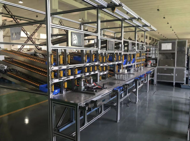 挥发加热器自动化装配线主要由以下几部分组成:缓冲区仓库、装配线(包括主线和分装线,根据机型的差异可适当增加部件分装线)、检测线、包装区、成品库(包含发货区)。其主要工艺有:传动组风扇压接专用工装、燃烧室装配、整机装配、加热器出厂检测;功能有:防错功能是否漏装、成品开机运行检测、质量可追溯!本装配线可实现4种加热器线上生产,生产线品种切换时,工装、设备调整时间≤15分钟;设备效率达到6分钟/台;整线需要4-5人,可以极大解放劳动力。